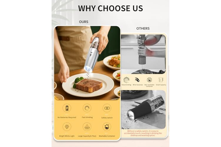 【Automatic Operation】The gravity salt and pepper grinder set electric uses advanced technology for easy one-handed operation. Simply flip the grinder to enjoy freshly ground spices without the need for manual grinding or pressing buttons. This salt and pepper grinder is a good helper for kitchens, restaurants, parties and outdoor picnics