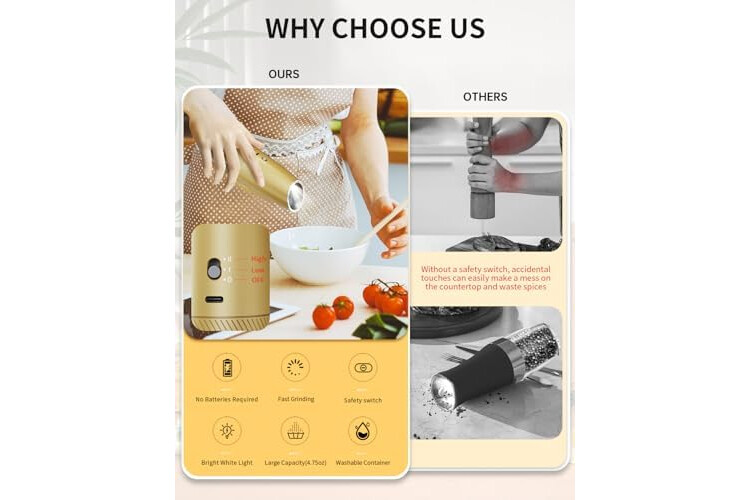 【Safety Lock 】Our gravity pepper grinder is designed with a safety lock to prevent accidental activation. Even if you touch it by mistake, it won’t start grinding, keeping your countertop clean and mess-free. The stylish, contemporary design adds a touch of modern elegance to your kitchen, effortlessly blending with any décor