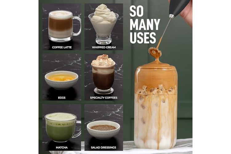 CREAMY VELVETY FROTH IN SECONDS: Making coffee-shop-style recipes at home is as simple as it can be with this milk frother. The 13,000 RPM motor and 25 spiral rings on the whisk let you whip up rich foam in no time. Level up your everyday warm or cold coffee, latte, cappuccino, hot chocolate, matcha, or powdered drinks with this coffee foam.