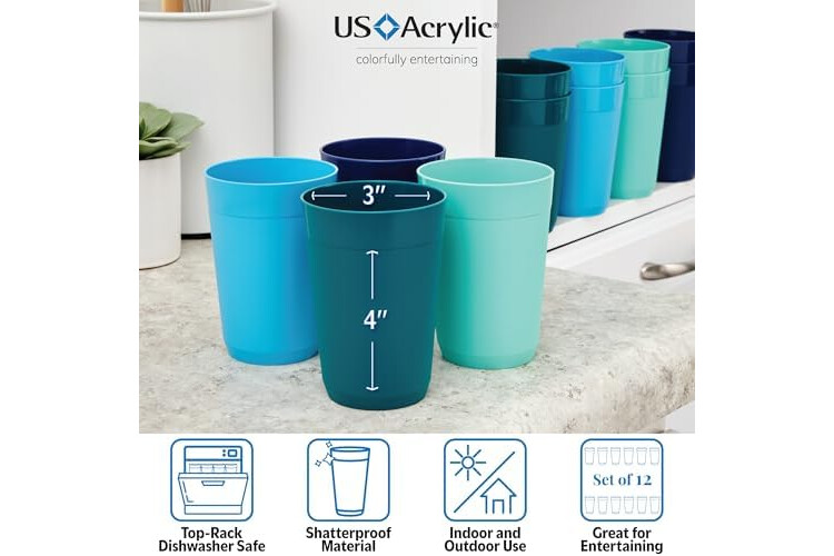 US Acrylic Newport 10 ounce Unbreakable Plastic Stackable Juice Tumblers in Coastal Colors | Set of 12 Drinking Cups | Reusable, BPA-free, Made in the USA, Top-rack Dishwasher and Microwave Safe