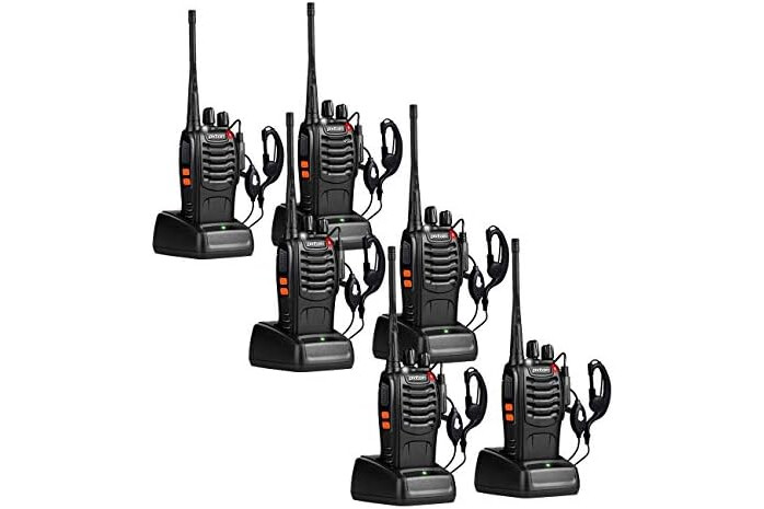 【Diversified functions】FCC ID: 2AX68PX-888S, 16 preset channels can be selected by rotating the knob on the 2 Way Radios to select any channel within the frequency range; you can program 50 CTCSS audio and 105 CDCSS audio on each programmed channel, The Two-Way Radios has the functions of VOX voice control, scanning, low battery alarm and night flashlight,etc;package contains (walkie talkie, battery pack, Charger, belt clip, hand strap, Earpieces) X 6 and 3 user manual.