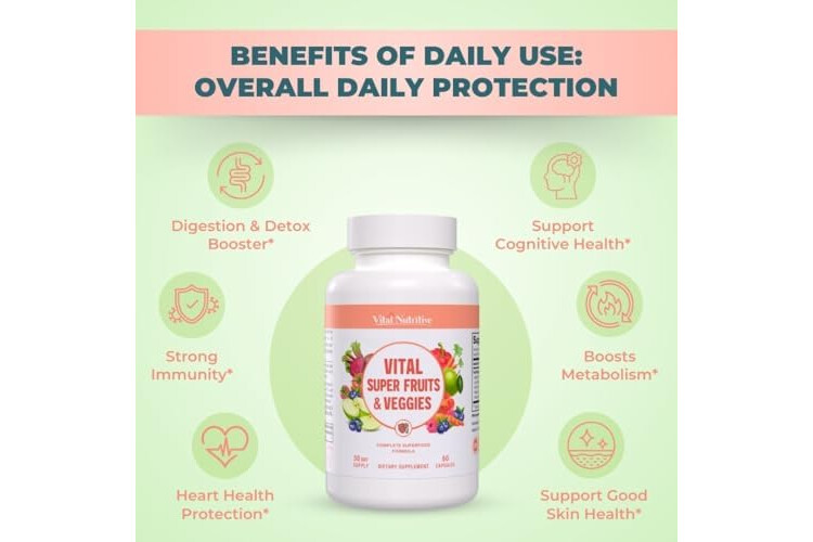 Taking Vital Super Fruits & Veggies daily may support digestion, sustained energy, and metabolism. Consistent use can help maintain heart health, cognitive function, and overall vitality.