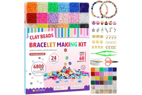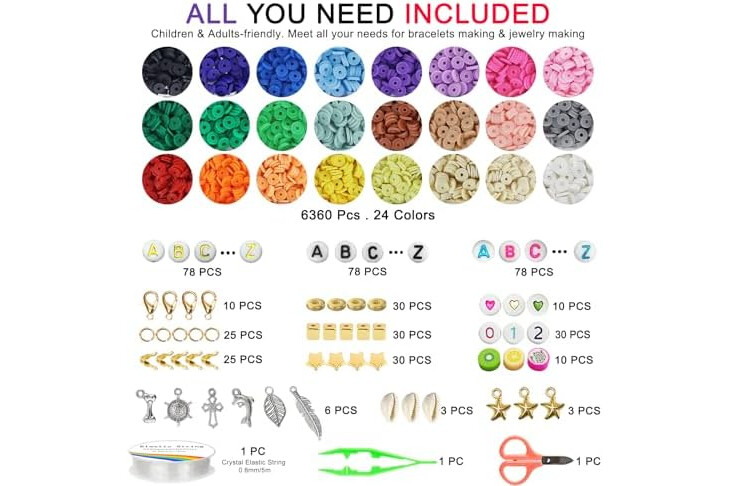 PERFECT BRACELET MAKING KIT - all you need included, about 6360pcs flat polymer clay beads and 500pcs charms kit (contains letter beads, number beads, heart beads, gold beads, spacer beads, clay beads charms, lobster clasp, etc.), 1 rolls of stretchy strings, a scissors, 1 plastic tweezers, this complete expansive jewelry making kit is filled with endless possibilities to be imaginative, to meet all your needs for bracelet making & jewelry making