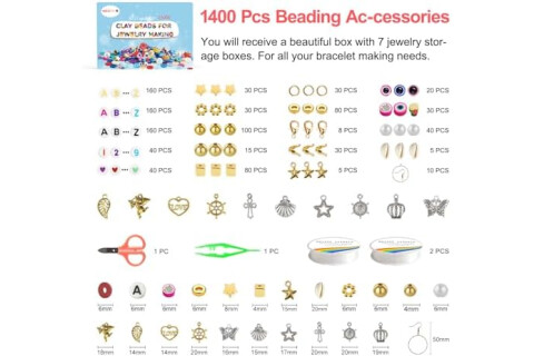 BRACELET MAKING KIT - Contains 22100pcs flat polymer clay beads in 144 colors and 1400pcs charms kit(including 160pcs each of black, gold, and colored letter beads, evil eyes beads, fruit beads, gold spacer beads, lobster clasp, etc.), 2 rolls of 10 meters stretchy strings,1 scissors, 1 plastic tweezers, 5 pairs of earrings, beads for jewelry making can meet your various DIY needs