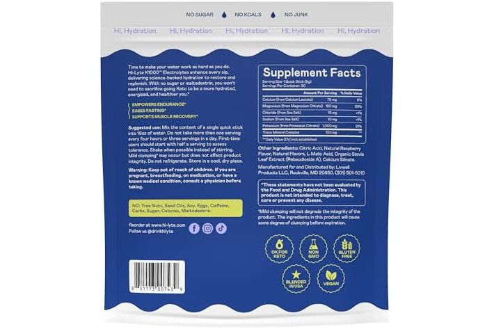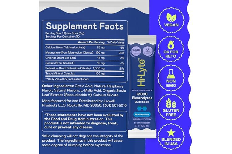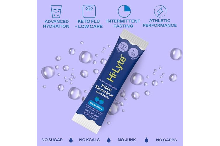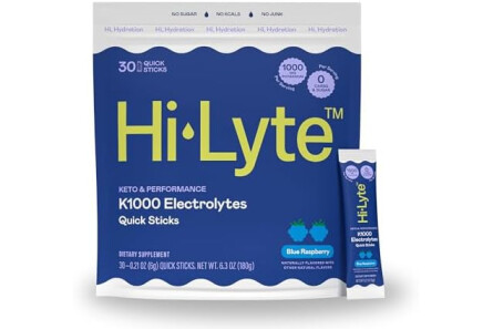 Hi-Lyte K1000 Electrolytes Sticks Blue Raspberry Keto & Performance, 30 Servings - 1000mg Potassium + Magnesium, Sodium, Trace Minerals - 0 Carbs, 0 Sugar