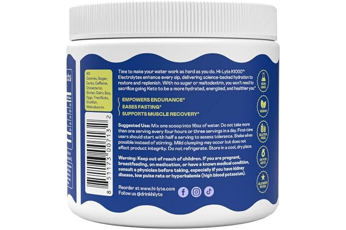 1000MG POTASSIUM + SUPPORTIVE MINERALS PER SCOOP - Hi-Lyte K1000 delivers 1000 mg of potassium along with calcium, magnesium, and a full trace mineral complex to help support hydration, cramp relief, and electrolyte balance-especially important on low-carb or active days.