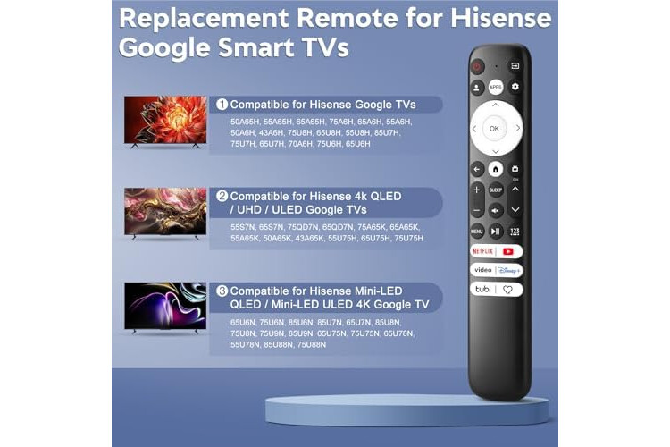 Compatible TV Models: Replacement remote control for Hisense Google TV, compatible with Hisense U6 U7 U70 U75 U8 U68N U78N U88N UX A4K A65H L5H series Google tvs. Compatible with Hisense Google TV models: 75U9N 85U9N 85U7N 55U75N 65U75N 65U6N 75U6N 85U68N 55U78N 85U88N55S7N 65S7N etc.