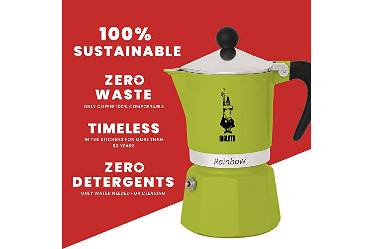 Zero waste: making coffee with moka pots only produces waste in terms of the coffee used (100% compostable). Zero detergent: to clean the Rainbow pot, simply rinse with clean water after use. Long-lasting: the Bialetti moka pots are made to last a lifetime!"