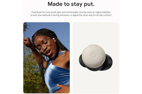 Pixel Buds Pro 2 are small, light, and made to stay put; use the twist-to-adjust stabilizer to lock your earbuds in during workouts, or adjust the other way for all-day comfort