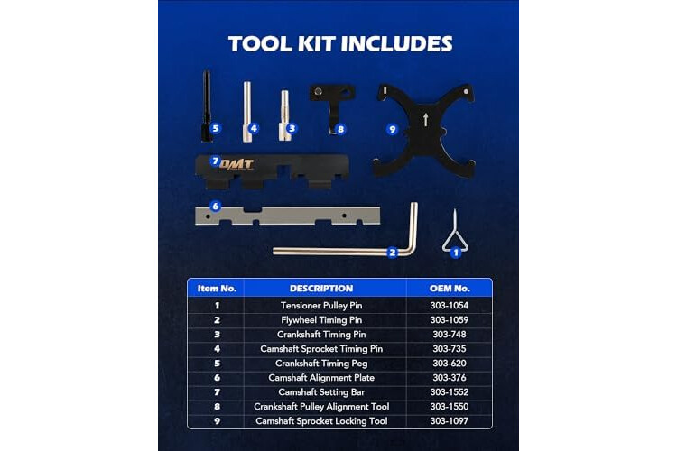 EASY TO USE: This OEM-equivalent engine timing belt tool set includes a sprocket locking tool, a camshaft alignment plate, camshaft setting bar, crankshaft pulley alignment tool, crankshaft timing peg, and all the pins necessary