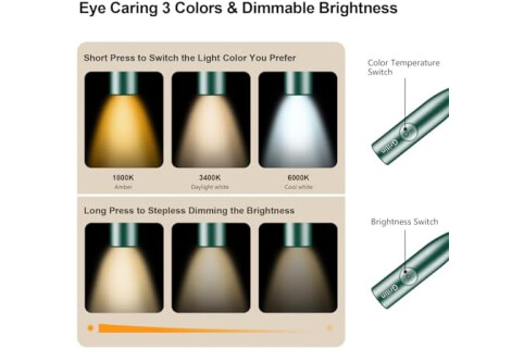 3 Colors and Stepless Dimming: Short press the color temperature button to switch color modes: Amber(1800K),Warm White(3400K),White(6000K); Long press the switch button to achieve stepless dimming, adjusting the brightness of the light at your needs