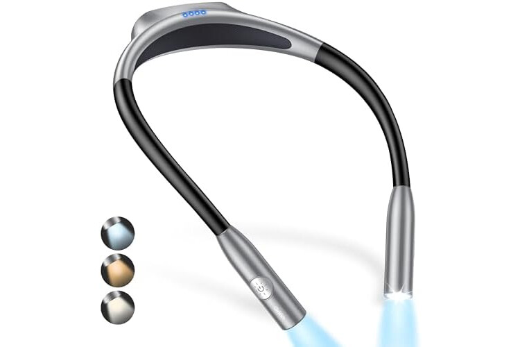 Gritin LED Neck Reading Light,Book Light for Reading in Bed-Eye Caring 3 Colors, Dimmable Brightness, Bendable Arms, 80+Hrs Runtime, Neck Round Design, Lightweight for Crafting, Knitting-Gray