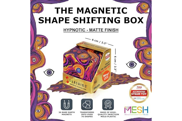Unlike other puzzle box toys that turn out disappointing & dull, the patented, award-winning shashibo sensory box features 36 rare earth magnets for an innovative design that transforms into over 70 shapes. Fits comfortably in the hand for hours of mind-challenging fun, stimulate the senses with unlimited creative possibility! Can you master the shape-shifting box?