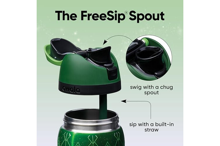 • Patented FreeSip spout designed for either sipping upright through the built-in straw or tilting back to swig from the spout opening