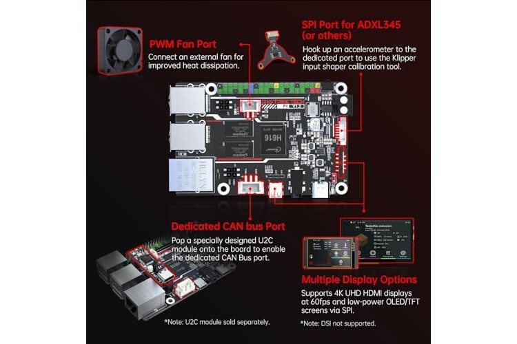 The BTT Pi is equipped with quad core 64 bit ARM Cortex-A53 1.5GHz processor, 1GB DDR3 memory chip, with powerful performance. Reserve SPI port, ADXL345 port, USB To CAN module(need to purchase U2C module) to enhance DIY performance