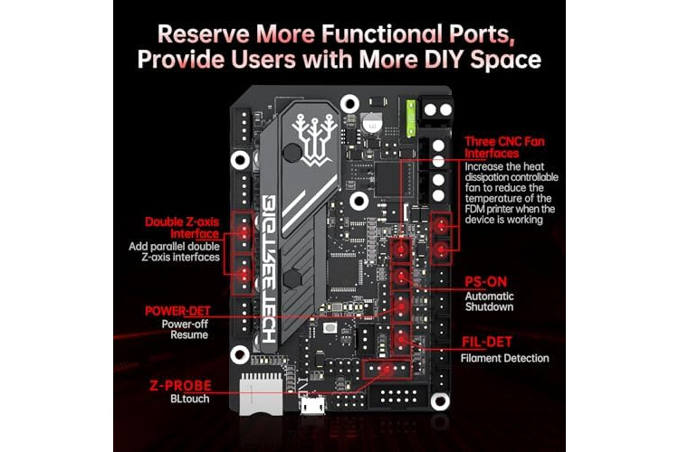 The SKR Mini E3 V3.0 adopts STMicroelectronics' latest G0 series main control chip STM32G0B1RET6 or STM32G0B0RET6; Adding controllable cooling fans and upgrading drive heat sink effectively reduces the temperature during 3d printing work