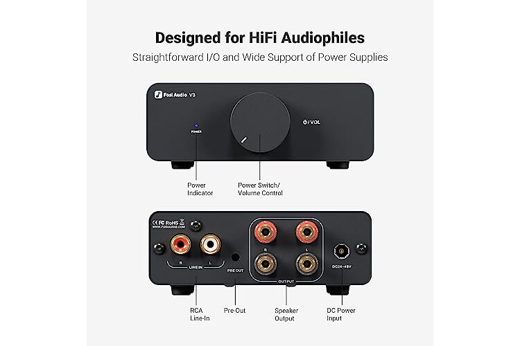Fosi Audio V3 Stereo Amplifier Home Audio 300 Watts x2 Power TPA3255 Class D Mini Speaker Amp 2 Channel Audio Component for Passive Bookshelf Tower Speakers Desktop Home Theater with 48V Power Supply