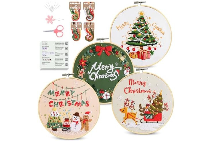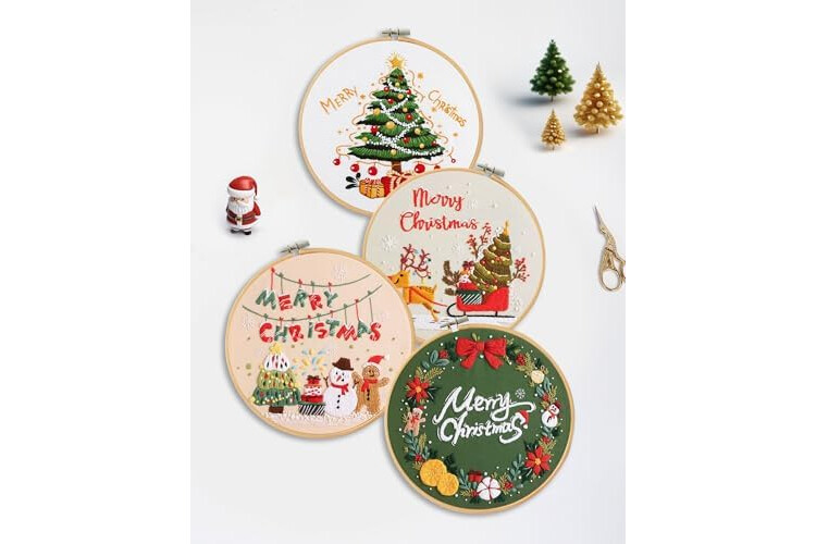 HIGH-QUALITY MATERIALS: Each kit includes an ample supply of premium threads, 2 durable embroidery hoops, 12 needles, and pre-printed fabric patterns featuring festive designs such as Santa Claus, snowmen, Christmas trees, reindeer, and flowers (washable after completion). Every component has been carefully selected to ensure a satisfying crafting experience.