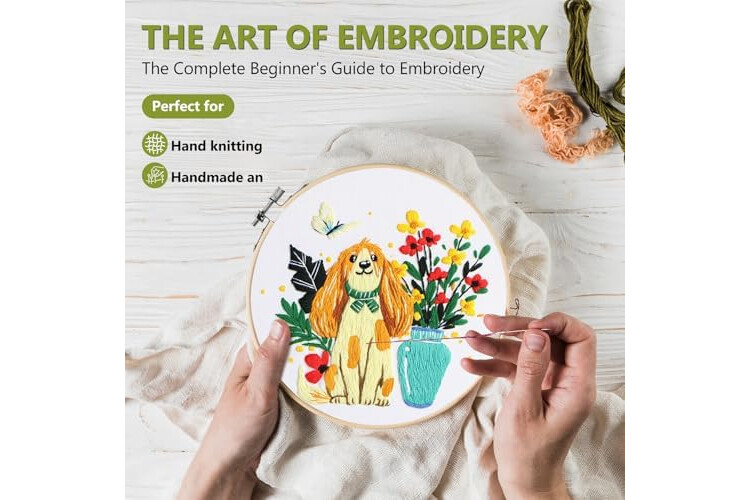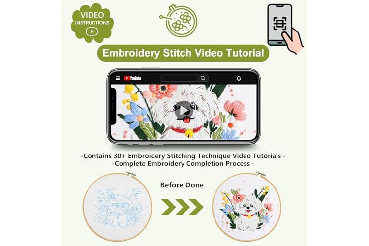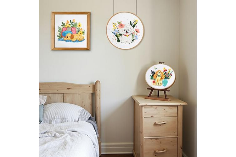 CUTE EMBROIDERY PATTERNS: This kit includes 3 dog & floral patterns printed on cloth, perfect for beginners. Follow the steps to complete each design, then wash away the water-soluble patterns for a clean, professional finish.