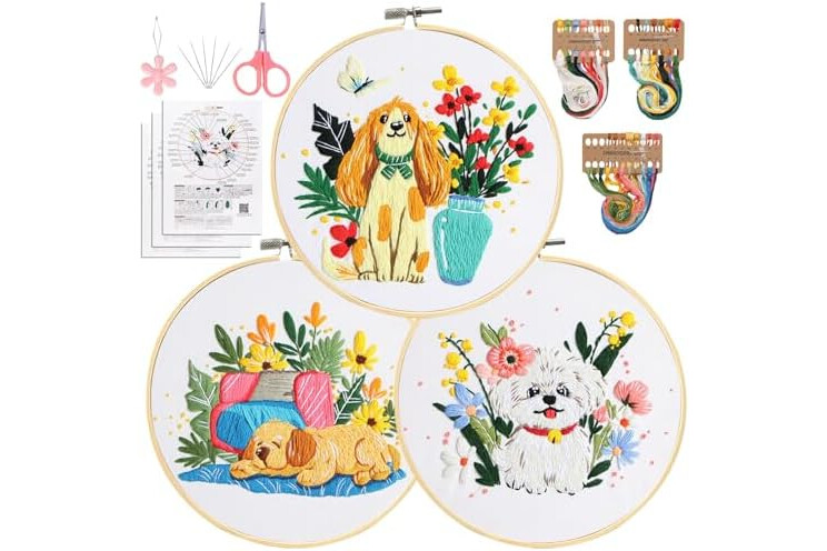 Santune 3 Pack Embroidery Kit for Beginners, Needlepoint Cross Stitch Kits for Adults,Needle Point Sets with Stamped Dog Pattern Stitch Video Tutorial,Mothers Day Gifts