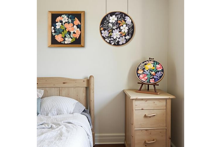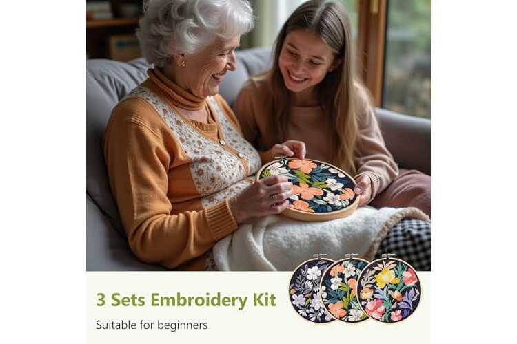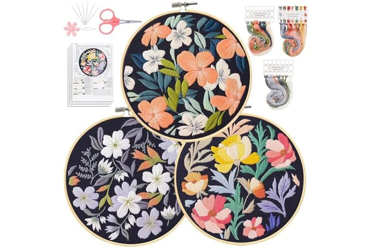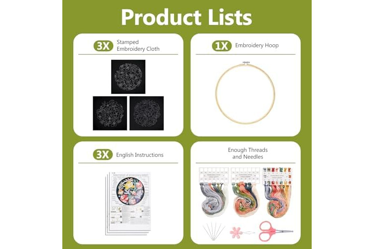 ALL-INCLUSIVE EMBROIDERY KIT: Includes 3 patterned embroidery cloths, 6 embroidery needles, 3 instruction sheets, 3 packs of colored threads, and a 7.8-inch (20 cm) embroidery hoop. This kit makes it easy to embark on your embroidery journey.