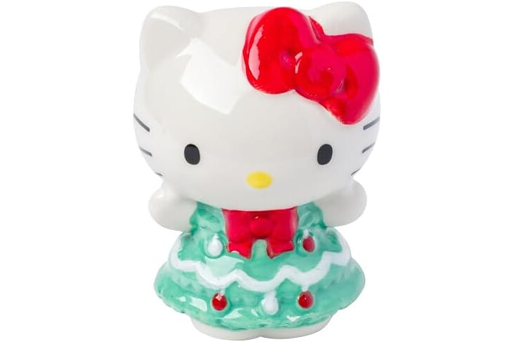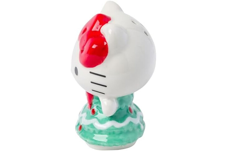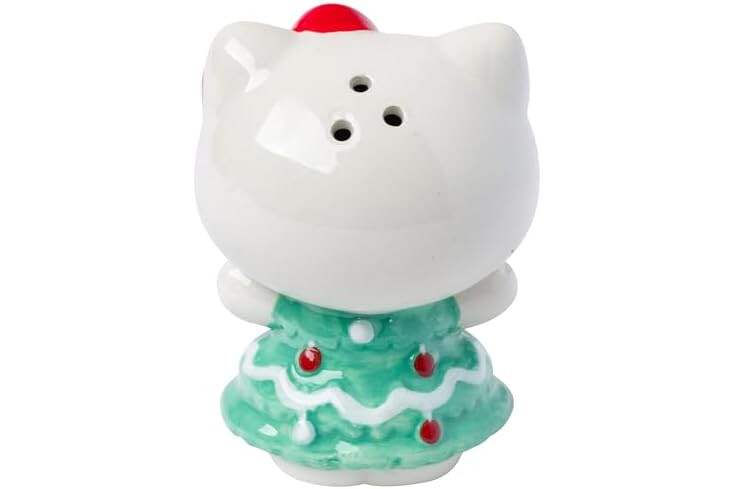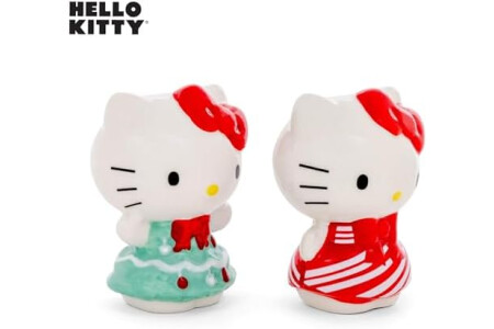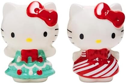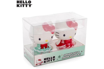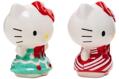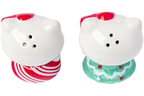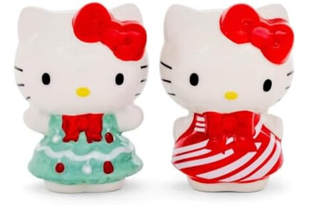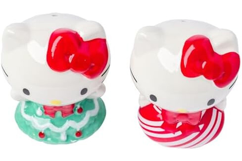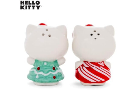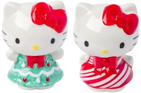 HAPPY HOLIDAYS FROM HELLO KITTY: Make your dining table extra festive this Christmas with this adorable Hello Kitty holiday salt and pepper shaker. Features Hello Kitty in a Christmas tree outfit and a Candy Cane striped outfit. Will add a charming touch to any kitchen for the holiday season.