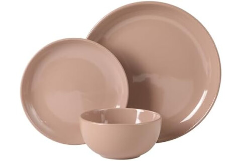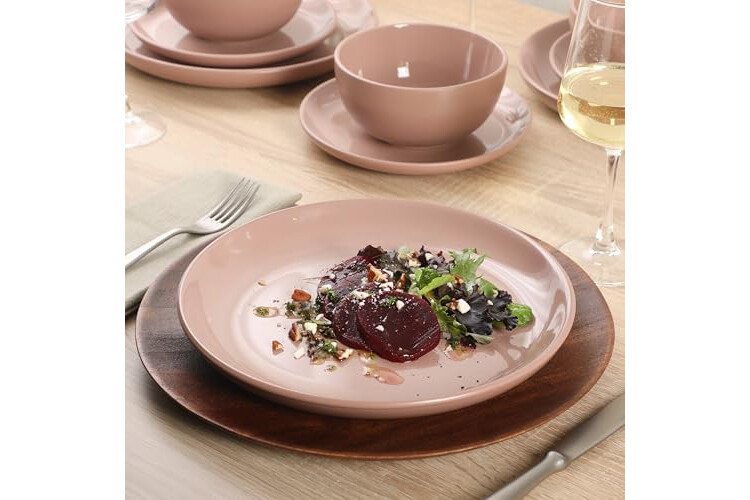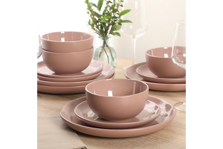 Gibson Home Rockaway 12 Piece Plates and Bowls Matte Outside/Shiny Inside Glaze Service for 4 Dinnerware Set - Pink - Dishwasher and Microwave Safe