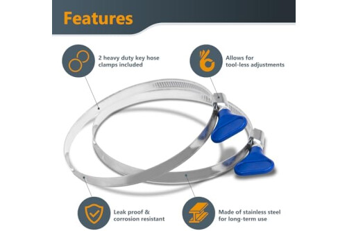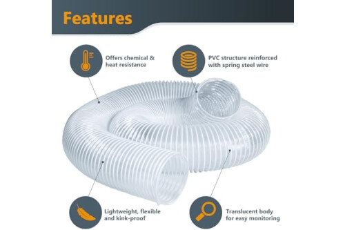 Includes: (1) 5" diameter 5 feet long left spiral clear flexible hose, (2) 5” Key Type Hose Clamps
