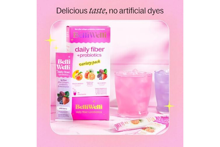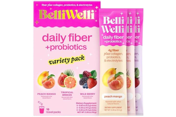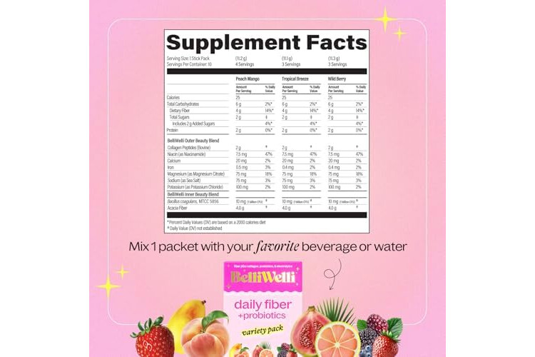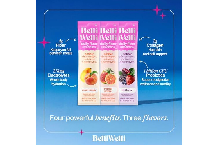 Belli Welli Fiber Supplement, Probiotics Fiber Powder Travel Pack for Women with Collagen & Electrolytes for Daily Gut Health & Debloating, Variety Pack, 10 Packets