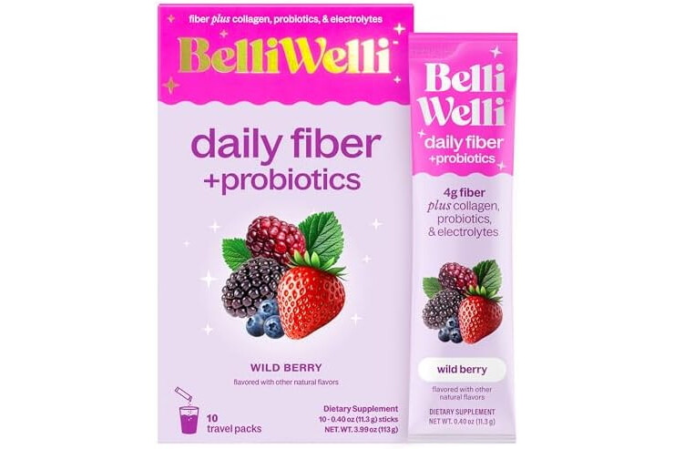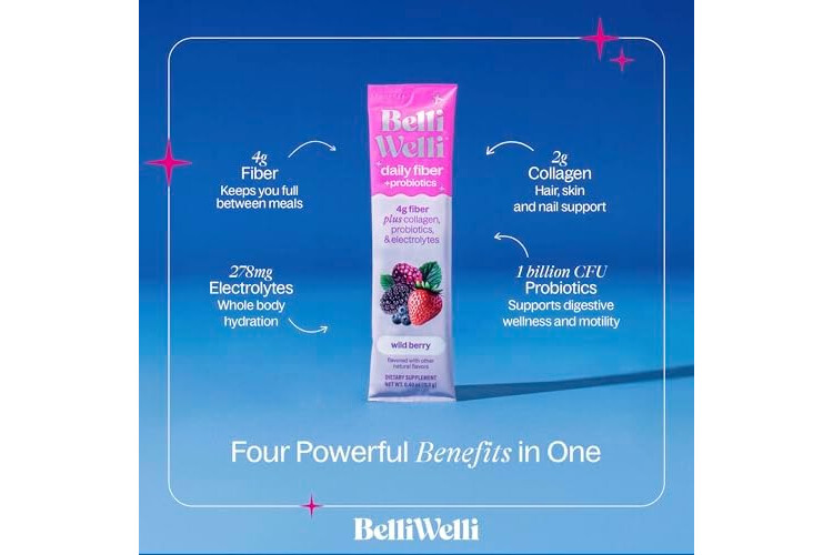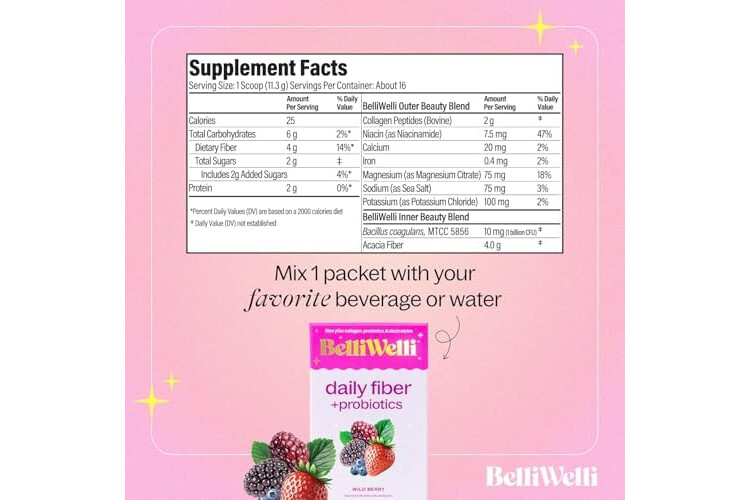 Belli Welli Daily Fiber Supplement Packets with Collagen, Probiotics & Electrolytes | Single Serve Packets for Gut Health, Digestion & Debloating | Wild Berry | 10 Count