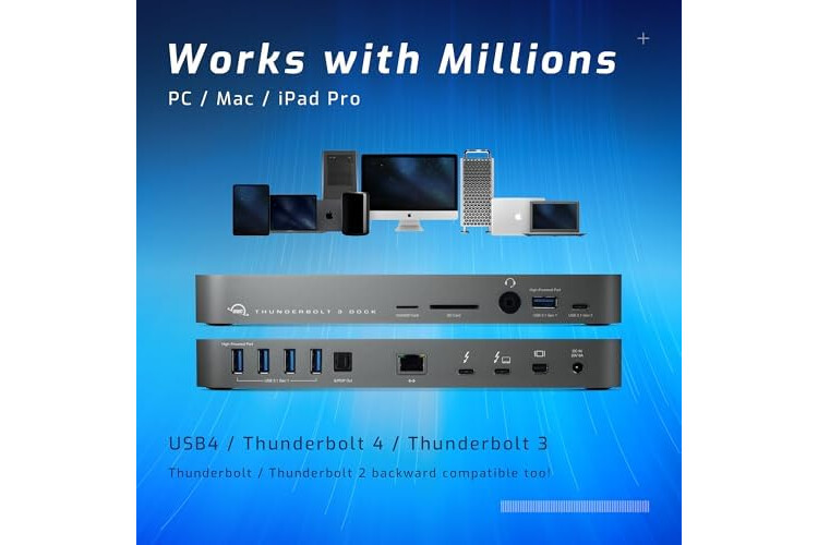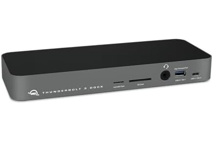 OWC 14-Port Thunderbolt Dock, 85W charging, (2) Thunderbolt 40 Gb/s (USB-C), (5) USB 3.2 Type-A, USB 3.2 (10Gb/s) Type-C, Mini DisplayPort, GbE, Audio, Single 5K or Dual 4K Displays, cable, For Mac/PC