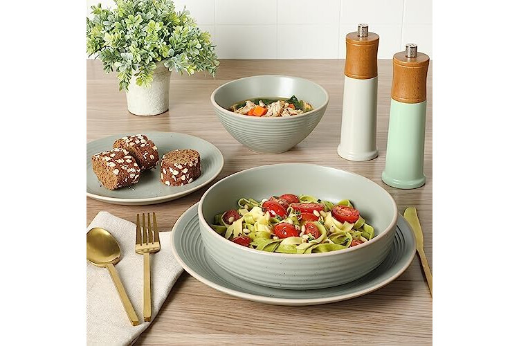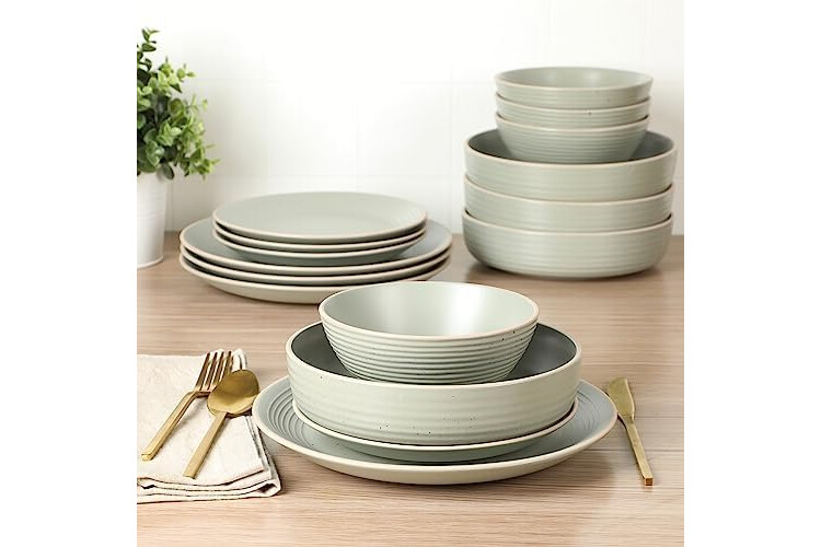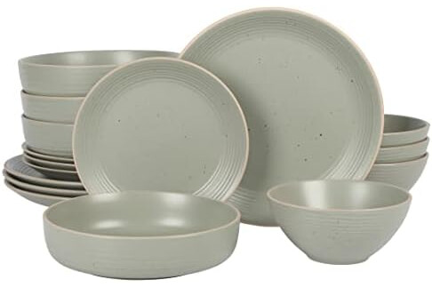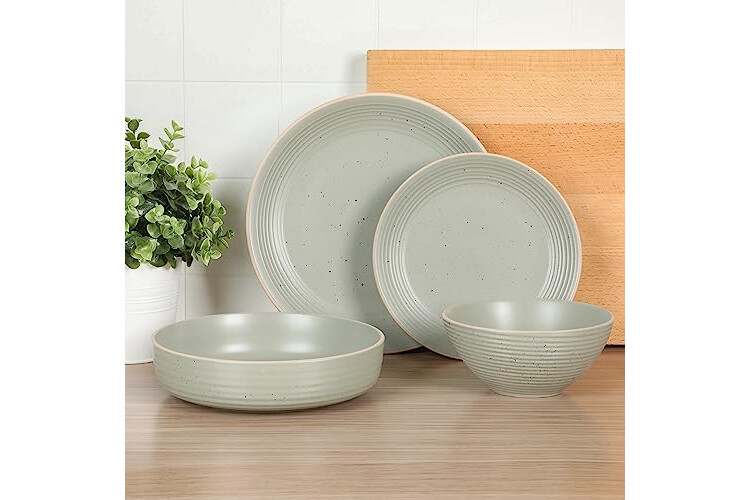 Gibson Home Dinah Double Bowl Stoneware Embossed Speckled Dinnerware Set - Sage Green, Service for Four (16pcs)