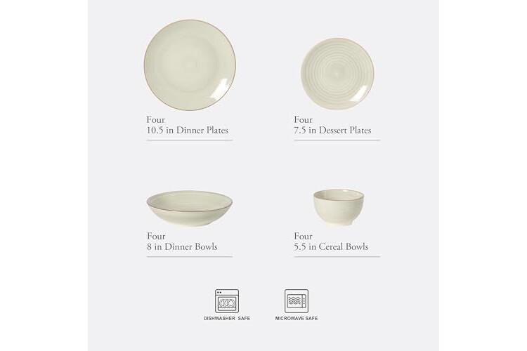 FOUR PLACE SETTINGS: This complete dinnerware set includes four 10.5-inch dinner plates, four 7.5-inch dessert plates, four 8-inch dinner bowls and four 5.5-inch cereal bowls. Suitable for a service for four to serve small breakfasts, quick lunches or gourmet dinners all year round.