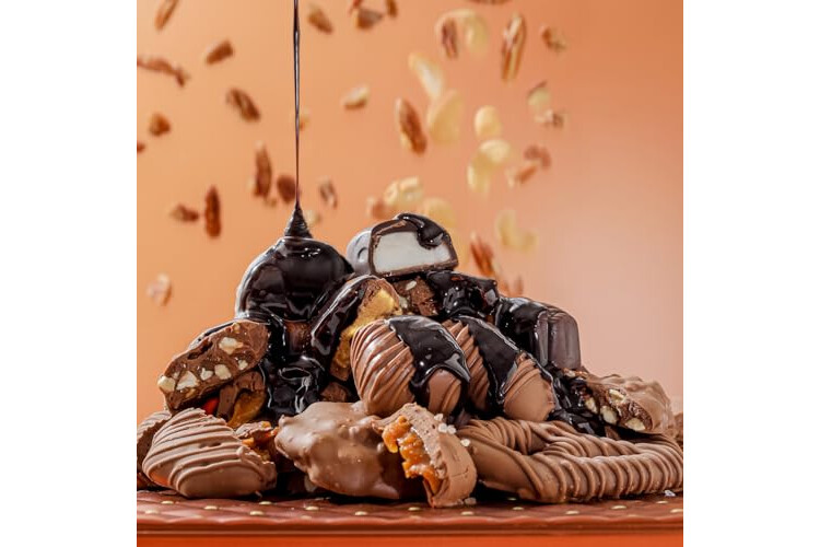 Holiday Chocolate Gift Basket with 15 Favorites: This festive chocolate gift basket is packed with over a pound of gourmet favorites, including Milk Butter Pecan Patties, Cashew Clusters, Sea Salt Caramels, English Toffee, Peppermint Patties, Bavarian Pretzels, Coconut Haystacks, and more. A perfect Christmas or holiday food gift for chocolate lovers of all ages—great for parties, winter snacks, or as a stocking stuffer.