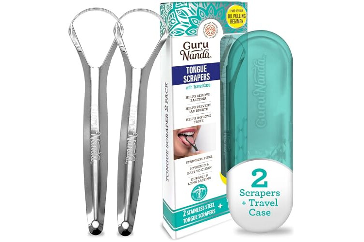 GuruNanda Tongue Scraper for Adults (2 Pack) with Travel Case, 420 Medical-Grade 100% Stainless Steel Tongue Cleaner, Aids in Fresh Breath & Oral Care