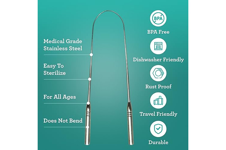 STAINLESS STEEL TONGUE SCRAPER FOR DURABILITY: Made with 420 medical grade steel, the tongue scraper is rust-proof and stain-resistant, helping you clean plaque gently for an improved sense of taste.