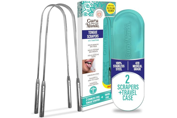 GuruNanda Tongue Scraper for Adults (2 Pack) with Travel Case, 420 Medical-grade 100% Stainless Steel Tongue Cleaner, Aids in Fresh Breath & Oral Care