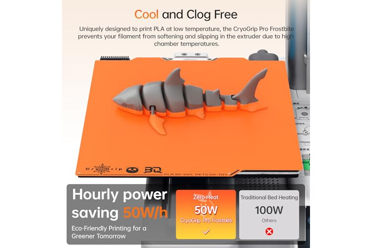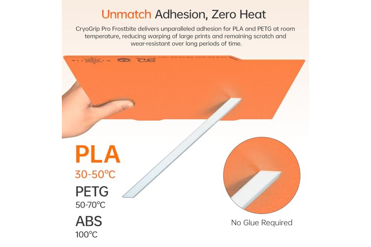 Low-Temp with No Glue Printing: CryoGrip Pro Frostbite Cold Build Plate delivers unparalleled adhesion for PLA(30-50℃) and PETG(50-70℃) at room temperature, while it also compatible with ABS(100℃), saving heating bed time, 50% power reduction, eco-friendly and clog free.