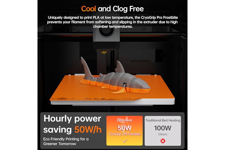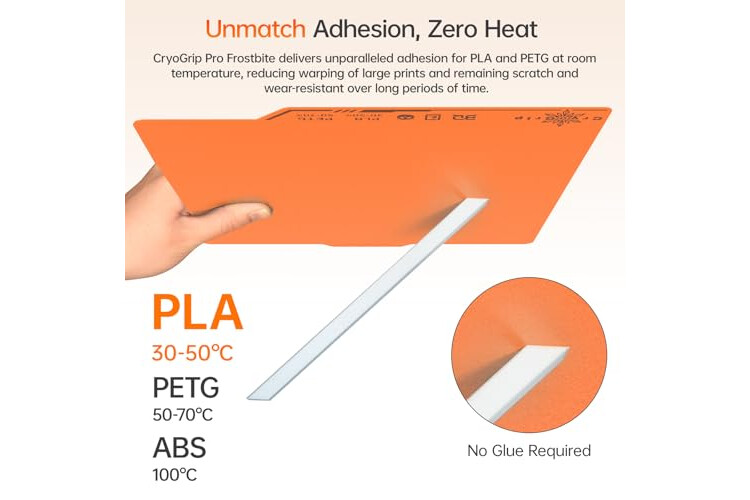 Low-Temp with No Glue Printing: CryoGrip Pro Frostbite Cold Build Plate delivers unparalleled adhesion for PLA(30-50℃) and PETG(50-70℃) at room temperature, while it also compatible with ABS(100℃), saving heating bed time, 50% power reduction, eco-friendly and clog free.