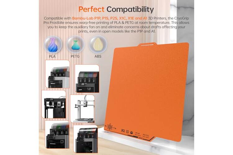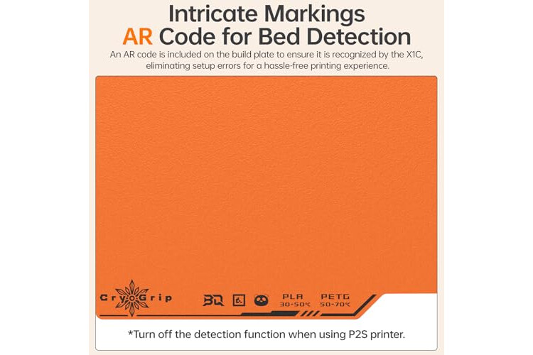 Perfect Compatibility: CryoGrip Pro Frostbite Cold Build Plate is for Bambu-Lab P1S, P1P, P2S, X1C, X1E, A1 3D Printers which has matte orange coating. An AR code is included on the build plate to ensure it is recognized by the X1C, eliminating setup errors for a hassle-free printing experience. NOTE: If you are using P2S, please turn off the plate printing detection.