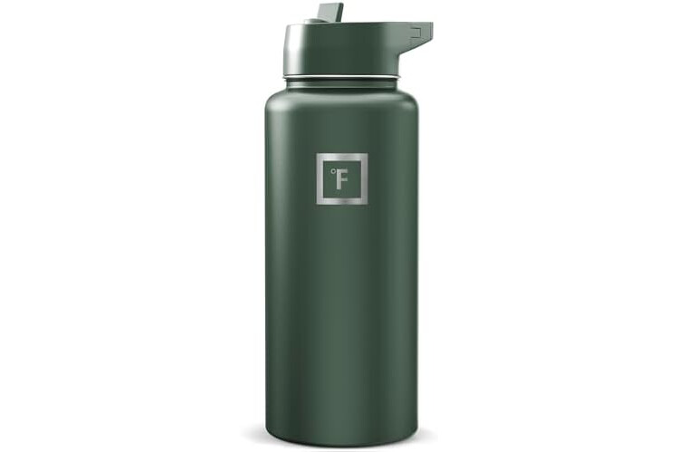 IRON °FLASK Camping & Hiking Hydration Flask with Straw, Wide Mouth Insulated Stainless Steel Sports Water Bottle - Dark Pine 32 oz - Straw (1 Lid)