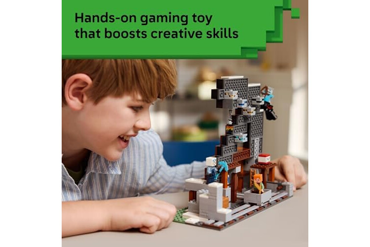 PRETEND PLAY – Kids extract ore from the mine, load it into a minecart and transport it along the track to be stored in a chest, all while fending off a hostile spider jockey
