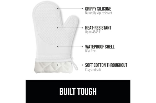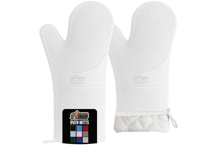 GORILLA GRIP BPA-Free Soft Silicone Oven Mitts, 14.5x8.3, Heat Resistant and Waterproof Cooking Gloves, Thick Cotton Lining, Flexible Gripping for Baking Grilling, Kitchen Potholders Set of 2, White