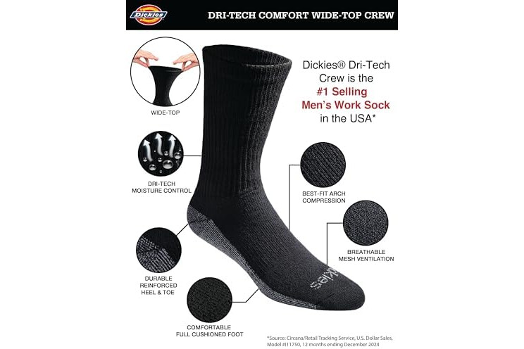 Dickies Men's Dri-Tech Original Moisture Control Crew Socks, Available in M-XXL (6, 12, 18 Pairs), Comfort Wide-Top Black (6 Pairs), X-Large