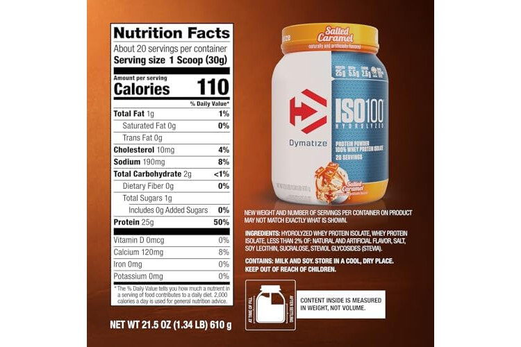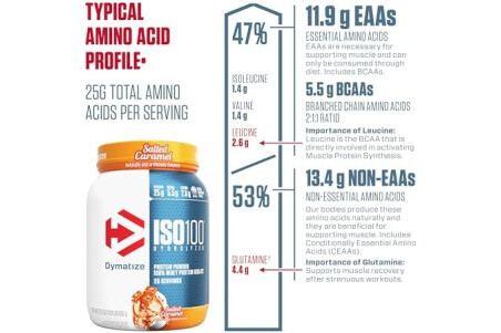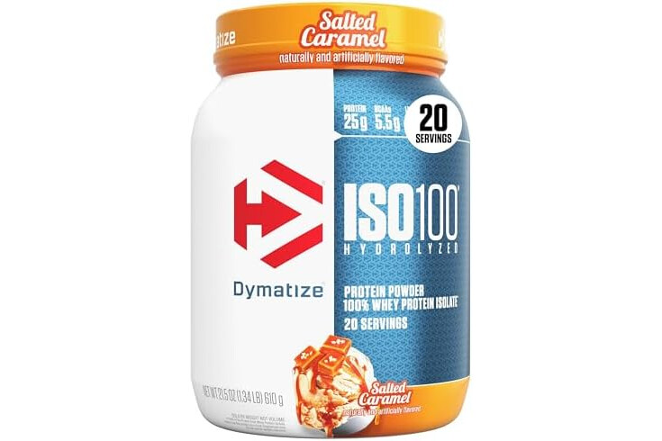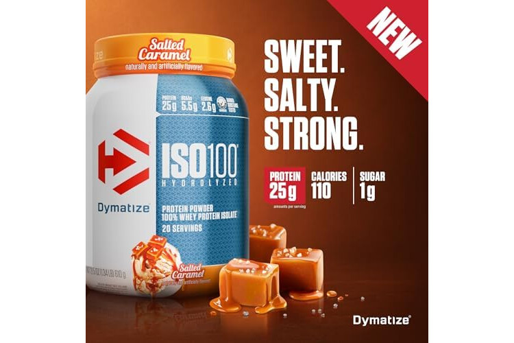 Dymatize ISO100 Whey Protein Powder Isolate, Salted Caramel, 25g of Protein, 5.5g BCAAs, Less Than 120 Cal., Gluten Free, 1g Fat, 1g Sugar, 2g Carb (20 Servings)
