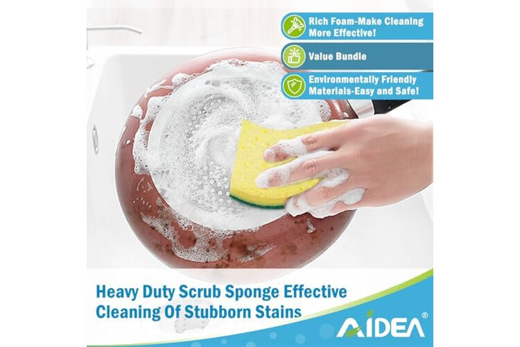 Built to Last: AIDEA cleaning sponges feature a scouring pad on one side and an absorbent sponge on the other; resistant to tearing and wear; suitable for removing tough, burned food stains; endure numerous uses