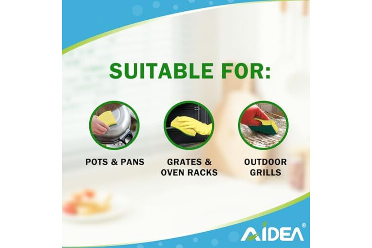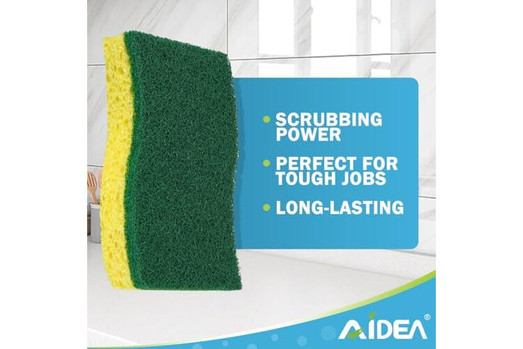 Built to Last: AIDEA cleaning sponges feature a scouring pad on one side and an absorbent sponge on the other; resistant to tearing and wear; suitable for removing tough, burned food stains; endure numerous uses