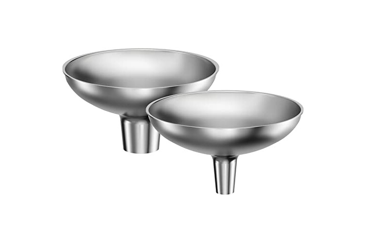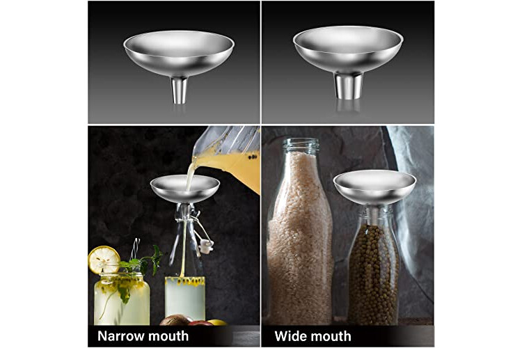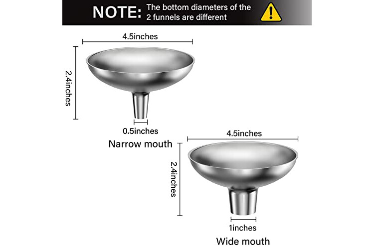 The durable stainless steel funnel mouth includes two sizes: large mouth: 1" for powdered spice transfers; small mouth: 0.5" for liquid transfers.