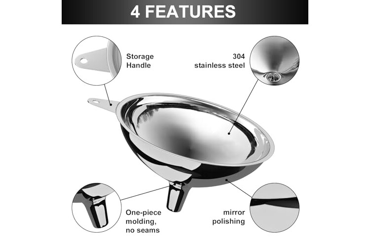 HIGH QUALITY AND DURABILITY: This wide-mouth canning funnel is made of food-grade stainless steel molded in one piece for durability and will not bend or rust. The bottom caliber edges are specially polished so they won't scratch you.