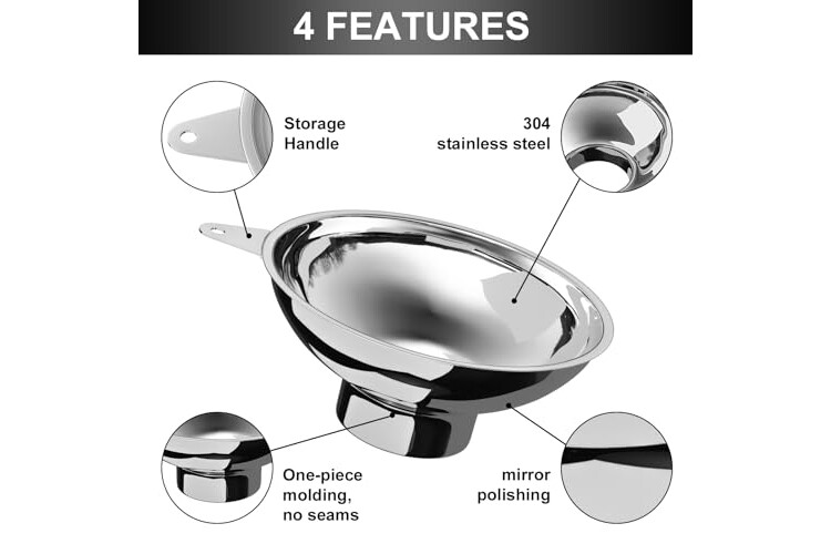 HIGH QUALITY AND DURABILITY: This wide-mouth canning funnel is made of food-grade stainless steel molded in one piece for durability and will not bend or rust. The bottom caliber edges are specially polished so they won't scratch you.
